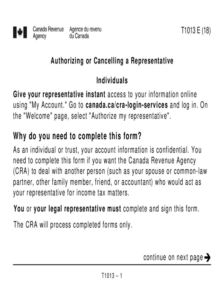 T1013 E (18)Authorizing or Cancelling a Representative Individuals Give your representative instant access to your information online using \” My Account.\” Go to canada.ca/craloginservices and
