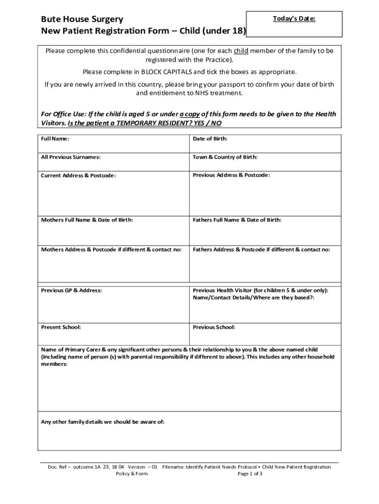 But House Surgery New Patient Registration Form Child (under 18)Today's Date:Please complete this confidential questionnaire (one for each child member of the family to be registered with the Practice).