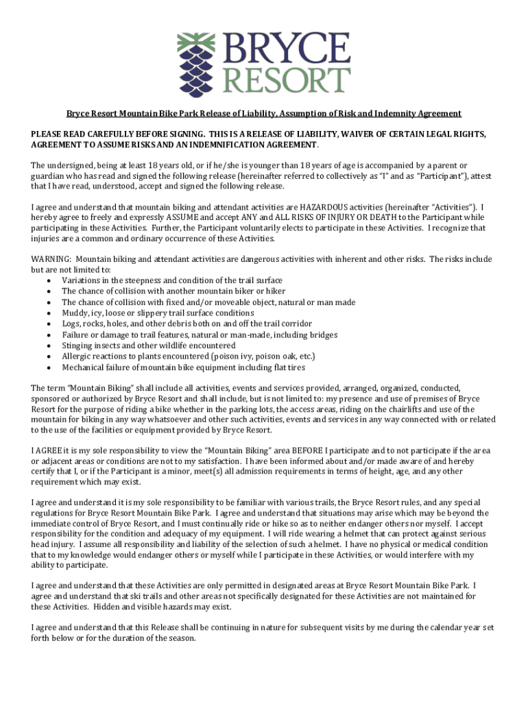 Bryce Resort Mountain Bike Park Release of Liability, Assumption of Risk and Indemnity Agreement PLEASE READ CAREFULLY BEFORE SIGNING. THIS IS A RELEASE OF LIABILITY, WAIVER OF CERTAIN LEGAL RIGHTS,