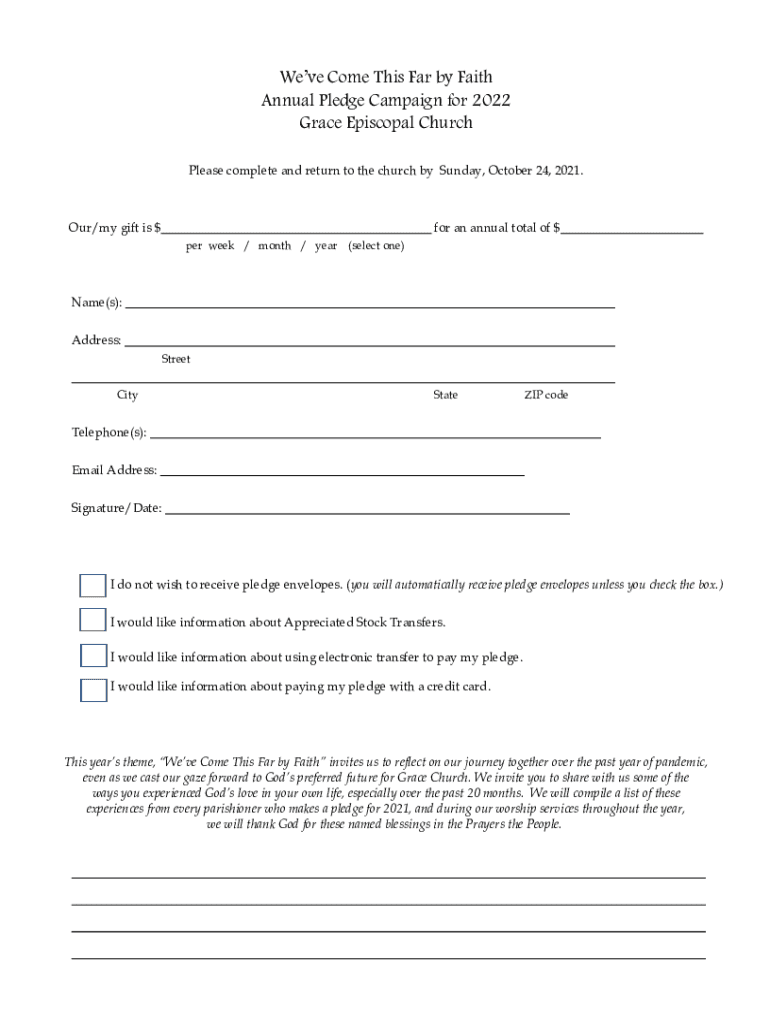 We've Come This Far by Faith Annual Pledge Campaign for 2022 Grace Episcopal Church Please complete and return to the church by Sunday, October 24, 2021. Our/my gift is for an annual total of $ per
