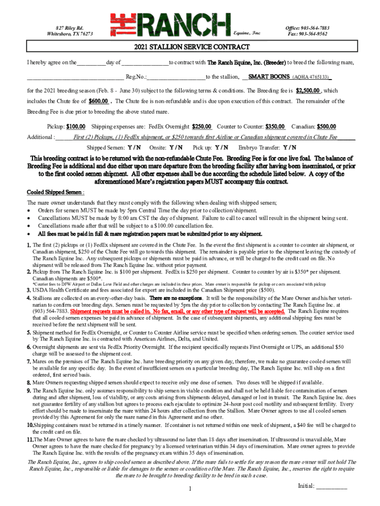 Fax: 90356495622021 STALLION SERVICE CONTRACT