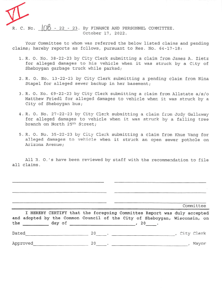 No. (08 22 23. By FINANCE AND PERSONNEL COMMITTEE. October 17, 2022. Your Committee to whom was referred the below listed claims and pending claims; hereby reports as follows, pursuant to Res. No.