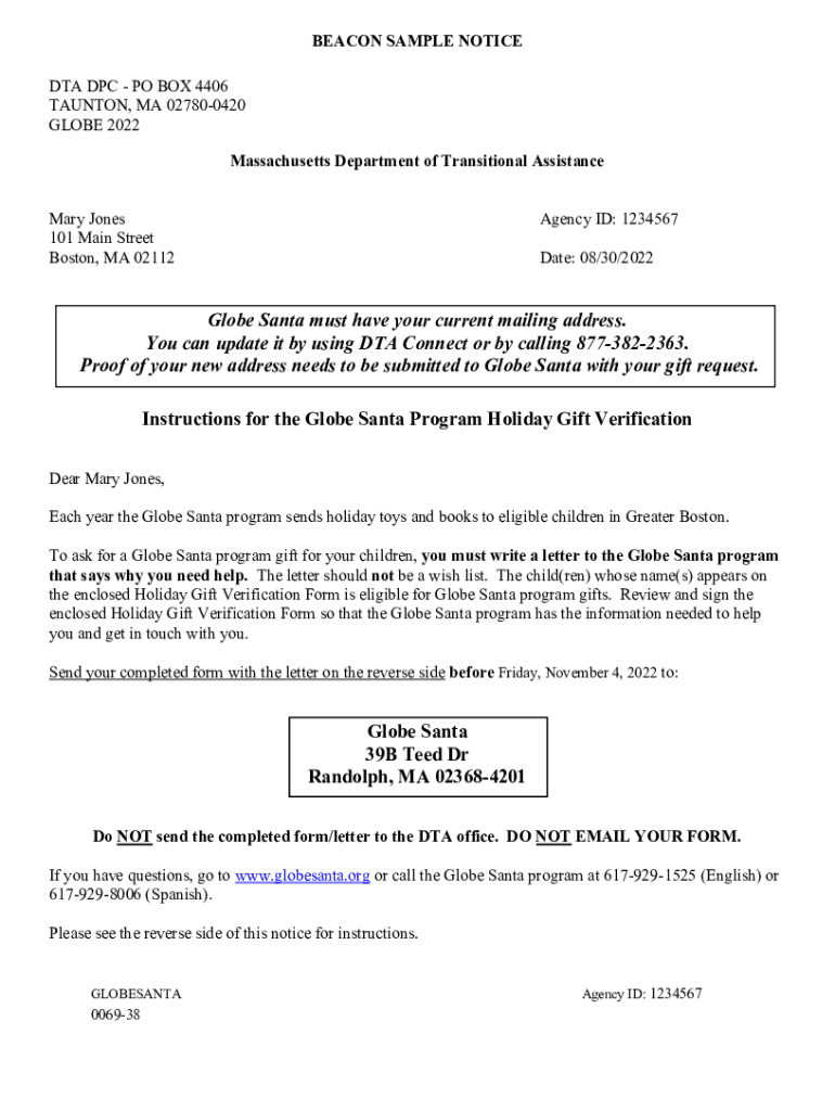BEACON SAMPLE NOTICE DTA DPC PO BOX 4406 TAUNTON, MA 027800420 GLOBE 2022 Massachusetts Department of Transitional Assistance Mary Jones 101 Main Street Boston, MA 02112Agency ID: 1234567 Date: 08/30/2022Globe