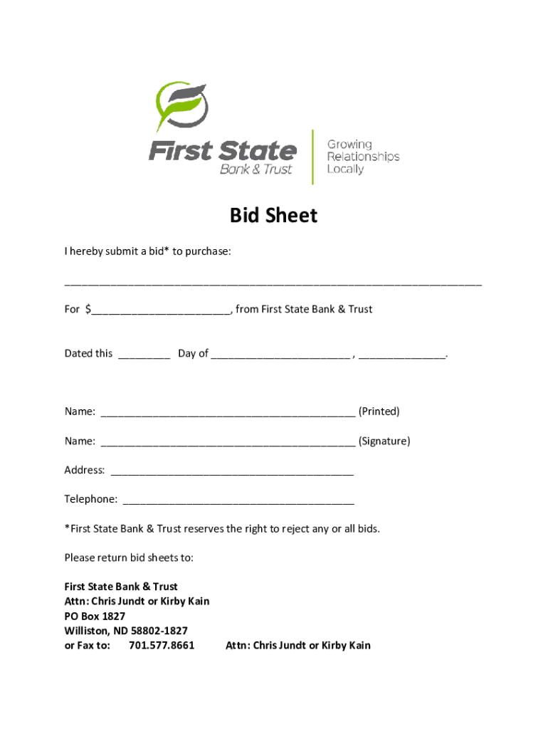Bid Sheet I hereby submit a bid* to purchase: ___ For $___, from First State Bank & Frustrated this ___ Day of ___, ___. Name: ___ (Printed) Name: ___ (Signature) Address: ___ Telephone: ___ *First