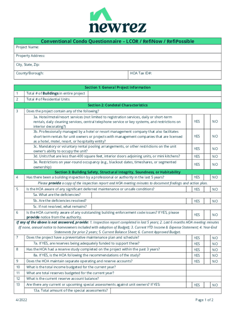 Conventional Condo Questionnaire LCR / Refined / Responsible
