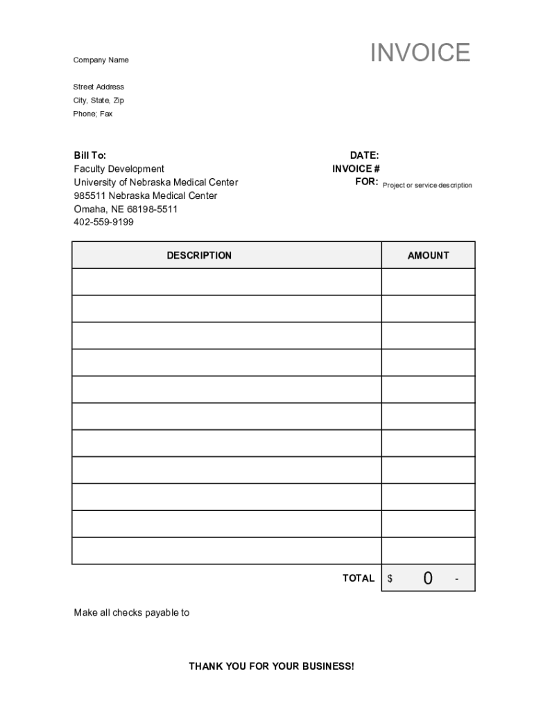 INVOICECompany Name Street Address City, State, iPhone; Fax Bill To: Faculty Development University of Nebraska Medical Center 985511 Nebraska Medical Center Omaha, NE 681985511 4025599199DATE: INVOICE