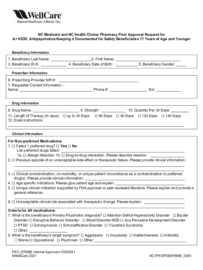 NC Medicaid and NC Health Choice Pharmacy Prior Approval Request for A+ KIDS: AntipsychoticsKeeping it Documented for Safety Beneficiaries 17 Years of Age and Younger Beneficiary Information1. Beneficiary