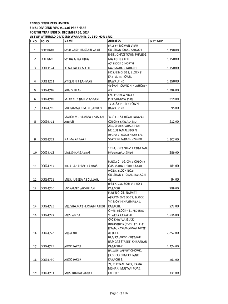 ENG RO FERTILIZERS LIMITED FINAL DIVIDEND 30% RS. 3.00 PER SHARE FOR THE YEAR ENDED : DECEMBER 31, 2014, LIST OF WITHHOLD DIVIDEND WARRANTS DUE TO VOLCANIC NAME ADDRESS S.NO FOLIO FACT F4 WOMAN VIEW
