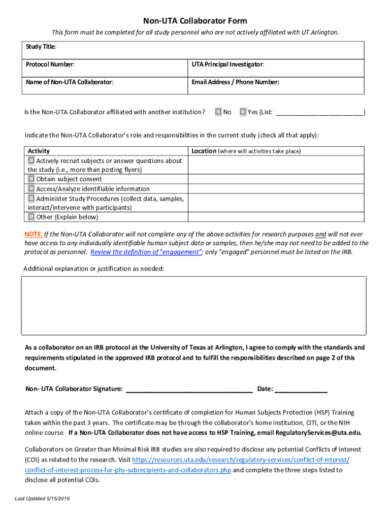 NonUTA Collaborator Form This form must be completed for all study personnel who are not actively affiliated with UT Arlington. Study Title: Protocol Number:UTA Principal Investigator:Name of NonUTA