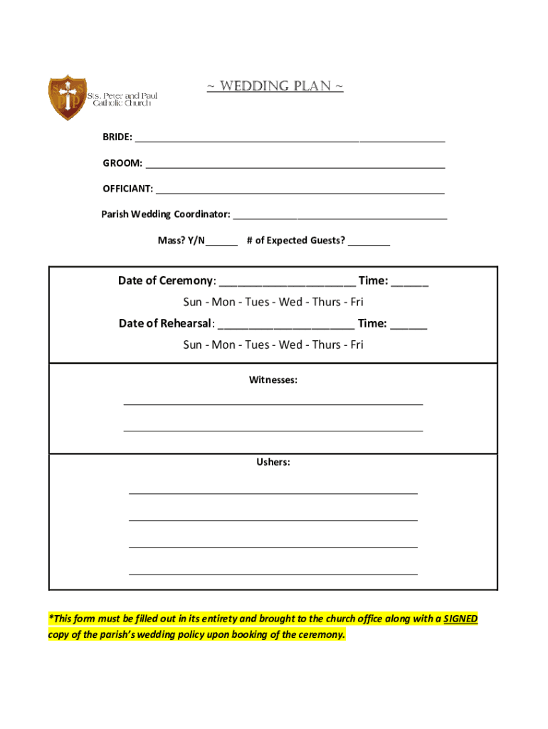Wedding Plan BRIDE: ___ GROOM: ___ OFFICIANT: ___ Parish Wedding Coordinator: ___ Mass? Y/N___ # of Expected Guests? ___Date of Ceremony: ___ Time: ___ Sun Mon Tues Wed Thurs Fri Date of Rehearsal: