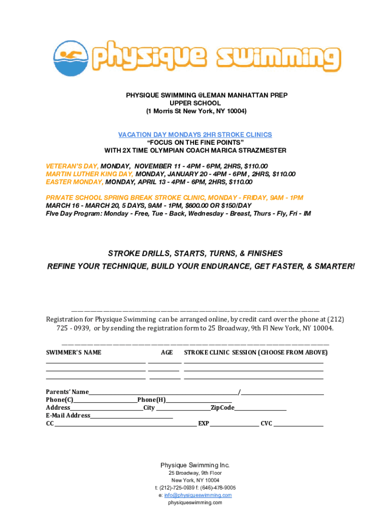 PHYSIQUE SWIMMING ALEMÁN MANHATTAN PREP UPPER SCHOOL (1 Morris St New York, NY 10004) VACATION DAY MONDAYS 2HR STROKE CLINICS FOCUS ON THE FINE POINTS WITH 2X TIME OLYMPIAN COACH MARIA TRIMESTER