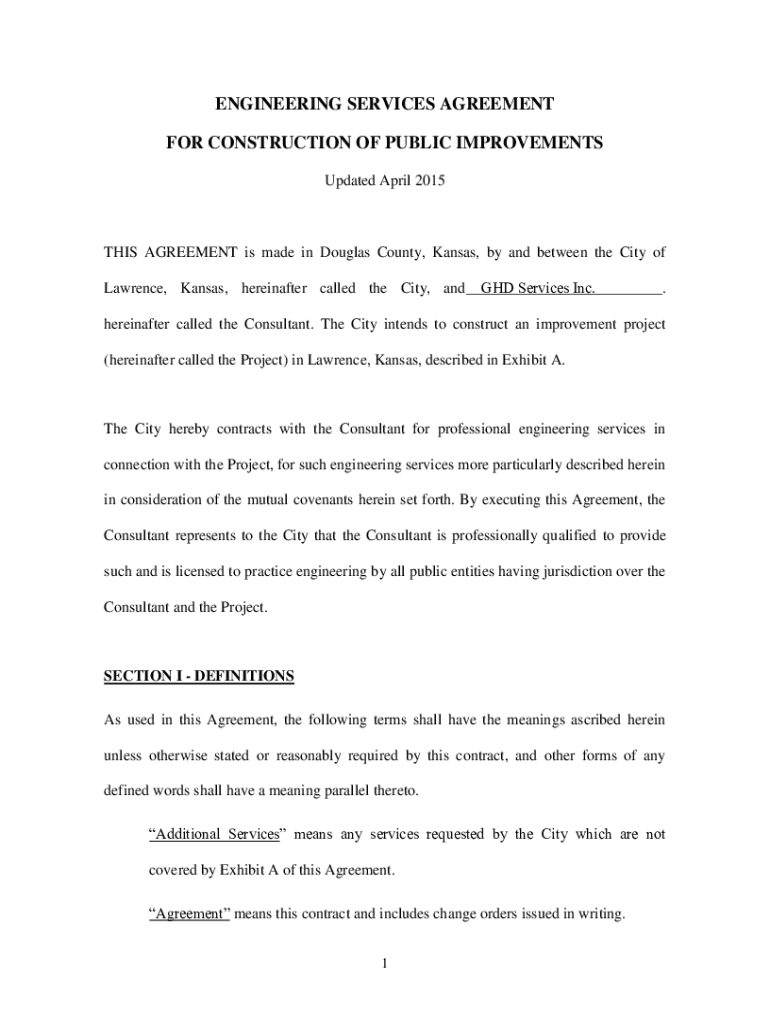 ENGINEERING SERVICES AGREEMENT FOR CONSTRUCTION OF PUBLIC IMPROVEMENTS Updated April 2015THIS AGREEMENT is made in Douglas County, Kansas, by and between the City of Lawrence, Kansas, hereinafter