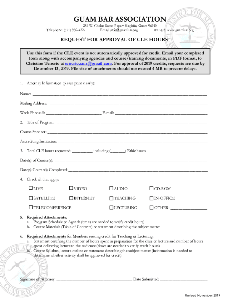GUAM BAR ASSOCIATION 284 W. Chain Santa Father Hag ta, Guam 96910 Telephone: (671) 9894227 Email: info@guambar.org Website: www.guambar.orgREQUEST FOR APPROVAL OF CLE HOURS Use this form if the CLE