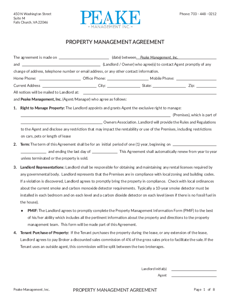 450 N Washington Street Suite M Falls Church, VA 22046Phone: 703 448 0212PROPERTY MANAGEMENT AGREEMENT The agreement is made on(date) betweenandPeake Management, Inc.(Landlord / Owner) who agree(s)