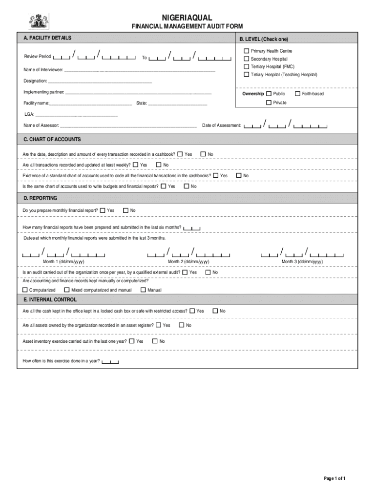 NIGERIAQUAL FINANCIAL MANAGEMENT AUDIT FORM A. FACILITY DETAILS. LEVEL (Check one)/Review Period//Primary Health Center/Secondary Hospital Tertiary Hospital (FMC)Name of Interviewee: ___Tertiary Hospital