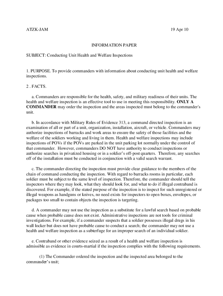 ATZKJAM19 Apr 10INFORMATION PAPER SUBJECT: Conducting Unit Health and Welfare Inspections1. PURPOSE. To provide commanders with information about conducting unit health and welfare inspections. 2.