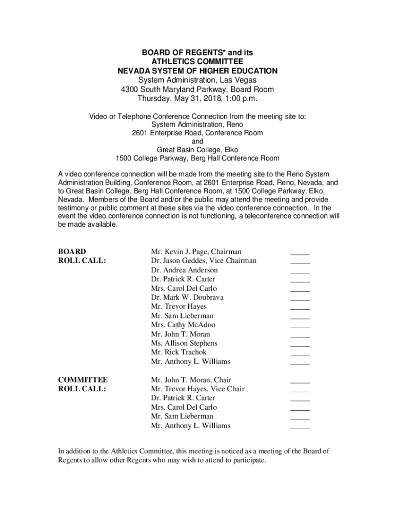 BOARD OF REGENTS* and its ATHLETICS COMMITTEE NEVADA SYSTEM OF HIGHER EDUCATION System Administration, Las Vegas 4300 South Maryland Parkway, Board Room Thursday, May 31, 2018, 1:00 p.m. Video or