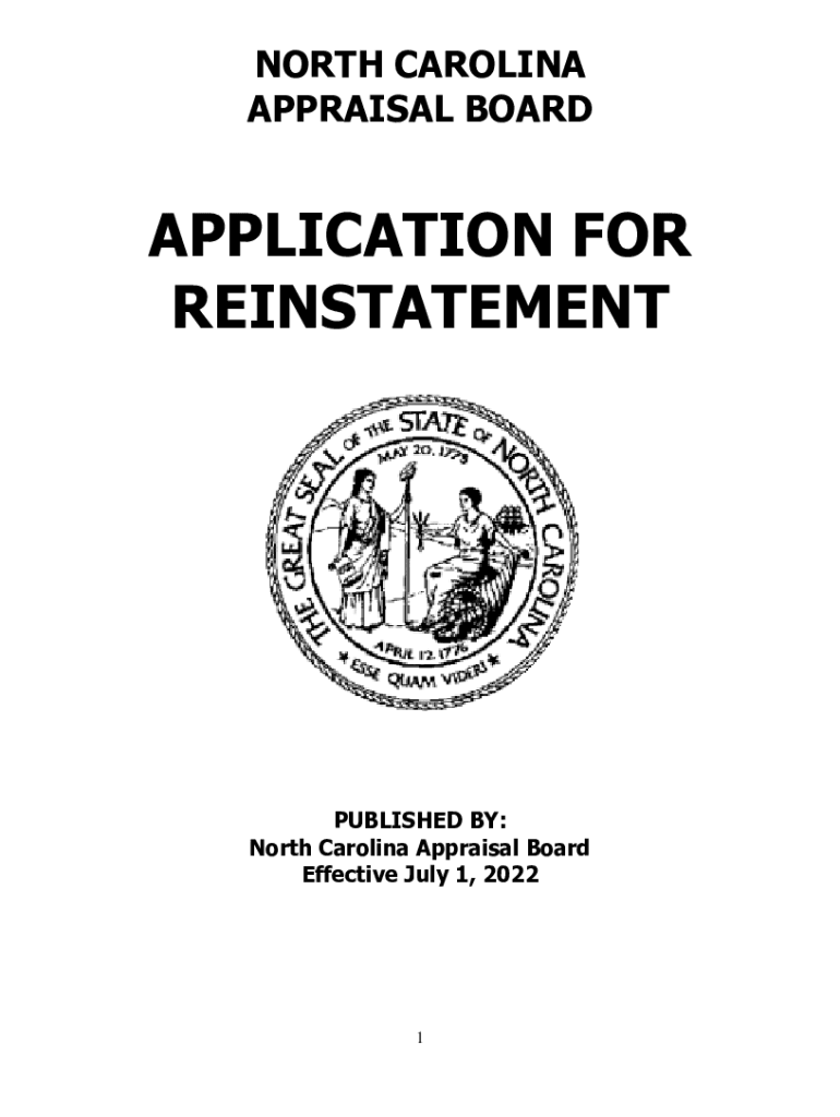 NORTH CAROLINA APPRAISAL BOARDAPPLICATION FOR REINSTATEMENTPUBLISHED BY: North Carolina Appraisal Board Effective July 1, 20221IntroductionGenerally, candidates can expect the reinstatement process