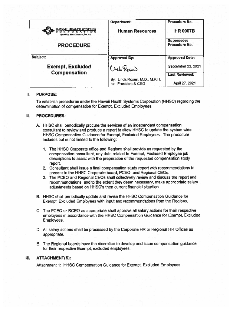 HAWAII HEALTH SYSTEMS C O R P O R A T I O N Quality Healthcare For Compensation GUIDANCE FOR EXEMPT, EXCLUDED EMPLOYEES HHSC Board Approved: 09/23/2021HAWAII HEALTH SYSTEMS CORPORATION COMPENSATION