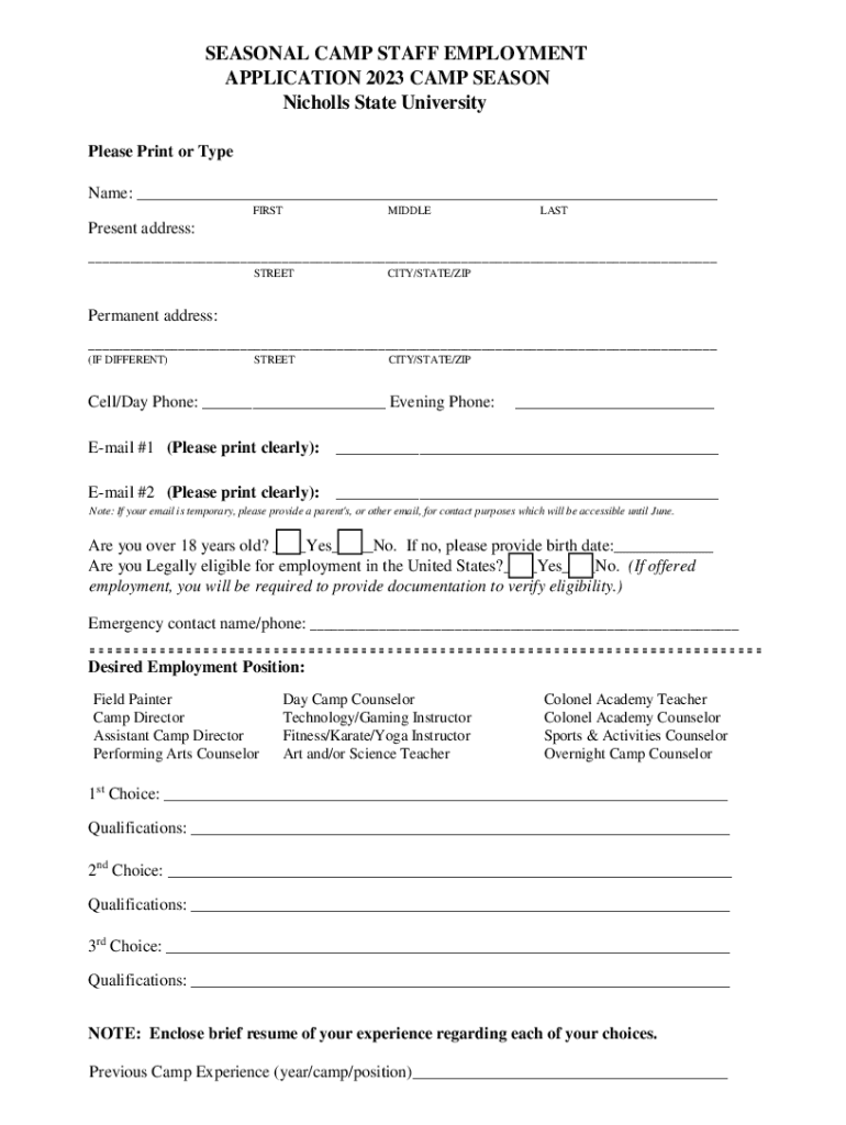 Come Join the Nicholls State University Summer Camp Team! 2023 SEASONAL CAMP STAFF EMPLOYMENT APPLICATION Nicholls State University is an Equal Opportunity/ADA/AAP Employer. We recruit, select, employ