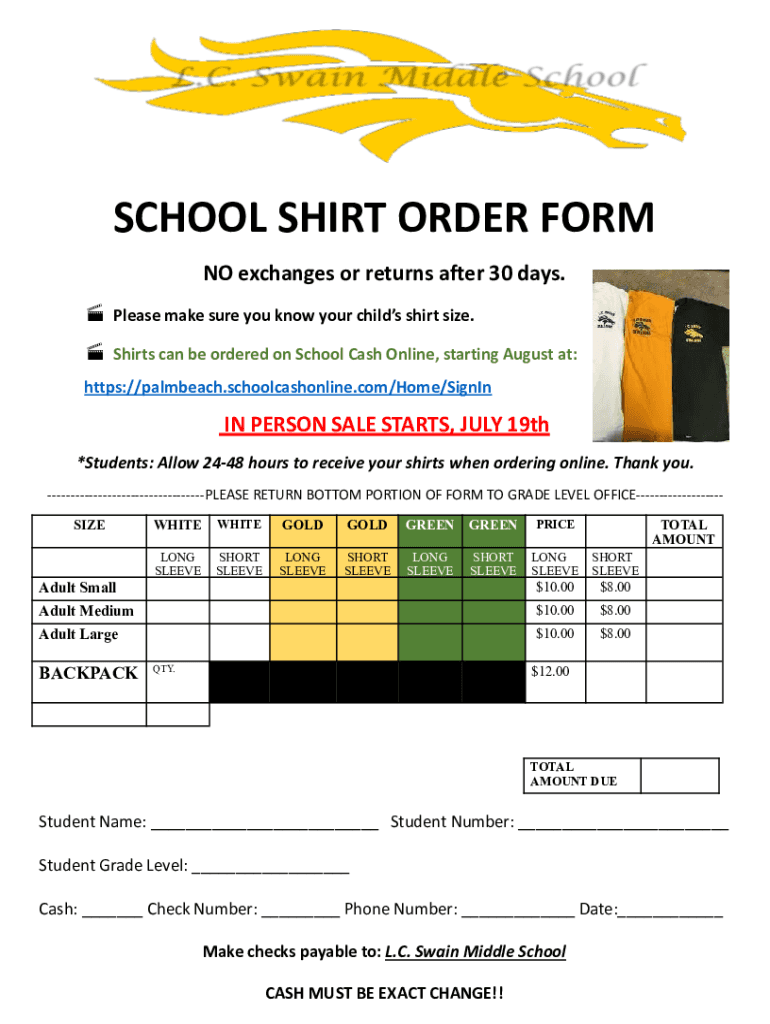 SCHOOL SHIRT ORDER FORM NO exchanges or returns after 30 days. Please make sure you know your children shirt size. Shirts can be ordered on School Cash Online, starting August at: https://palmbeach.schoolcashonline.com/Home/SignInIN