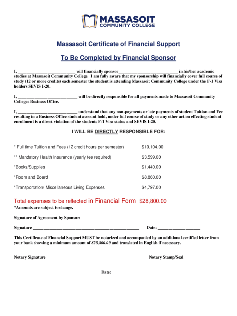 Get the free Massasoit Certificate of Financial Support To Be Completed by ...