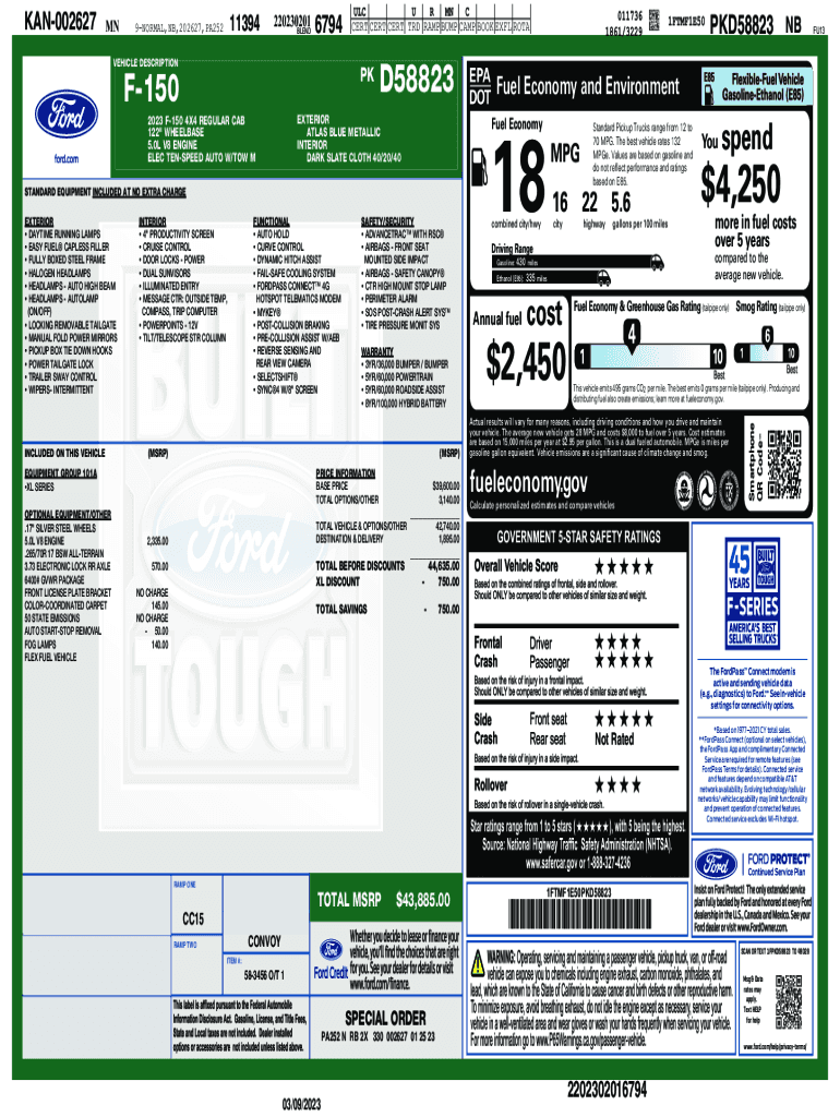 MN113949NORMAL,NB,202627,PA2526794VEHICLE DESCRIPTION ULC U R MN C CERT CERT CERT TRY RAMP BUMP CAMP BOOK EFL ROTAPKF150D58823EXTERIOR ATLAS BLUE METALLIC INTERIOR DARK SLATE CLOTH 40/20/402023 F150