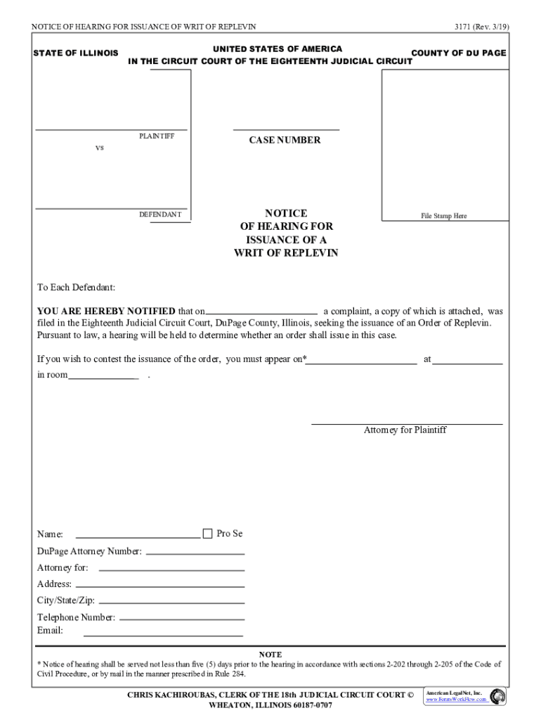 NOTICE OF HEARING FOR ISSUANCE OF WRIT OF REPLETION STATE OF ILLINOIS3171 (Rev. 3/19)UNITED STATES OF AMERICA COUNTY OF DU PAGE IN THE CIRCUIT COURT OF THE EIGHTEENTH JUDICIAL CIRCUITPLAINTIFFCASE