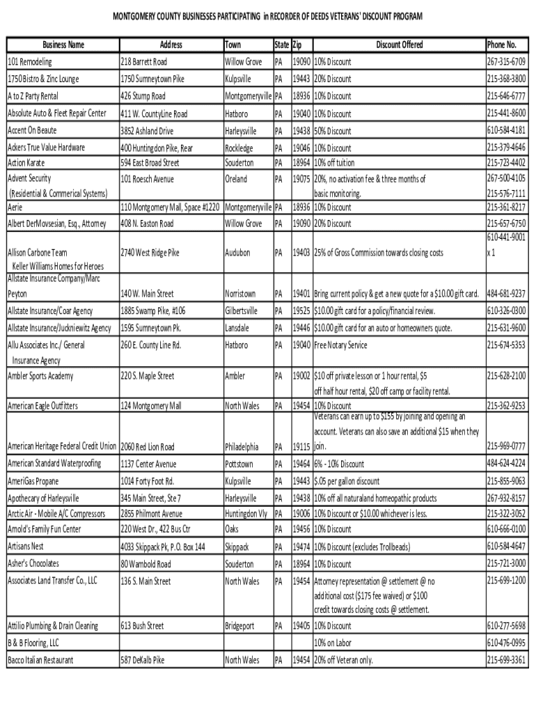 MONTGOMERY COUNTY BUSINESSES PARTICIPATING in RECORDER OF DEEDS VETERANS\' DISCOUNT PROGRAM