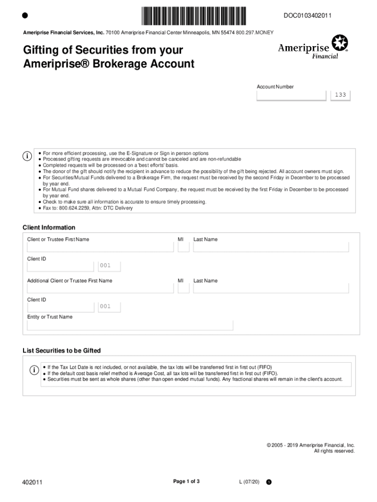 Get the free Form 402011 - Gifting of Securities from your Ameriprise Brokerage Account. Use this...