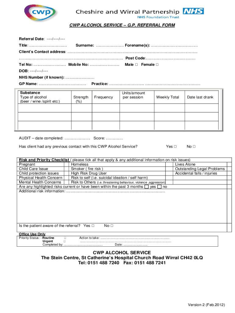 CWP ALCOHOL SERVICE G.P. REFERRAL FORMReferral Date: //Title:. Surname: Forename(s): ... Clients Contact address: