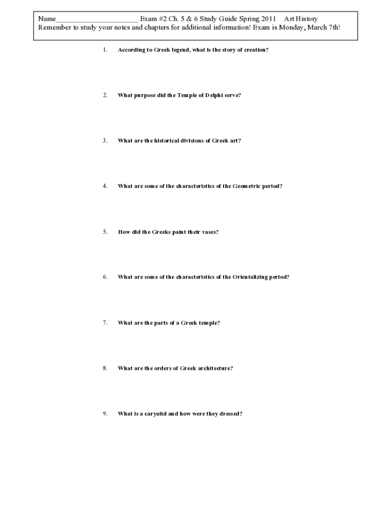 Name___ Exam #2 Ch. 5 & 6 Study Guide Spring 2011 Art History Remember to study your notes and chapters for additional information! Exam is Monday, March 7th! 1. According to Greek legend, what is