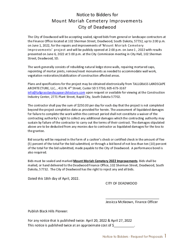 Notice to Bidders for Mount Mariah Cemetery Improvements City of Deadwood The City of Deadwood will be accepting sealed, signed bids from general or landscape contractors at the Finance Office located