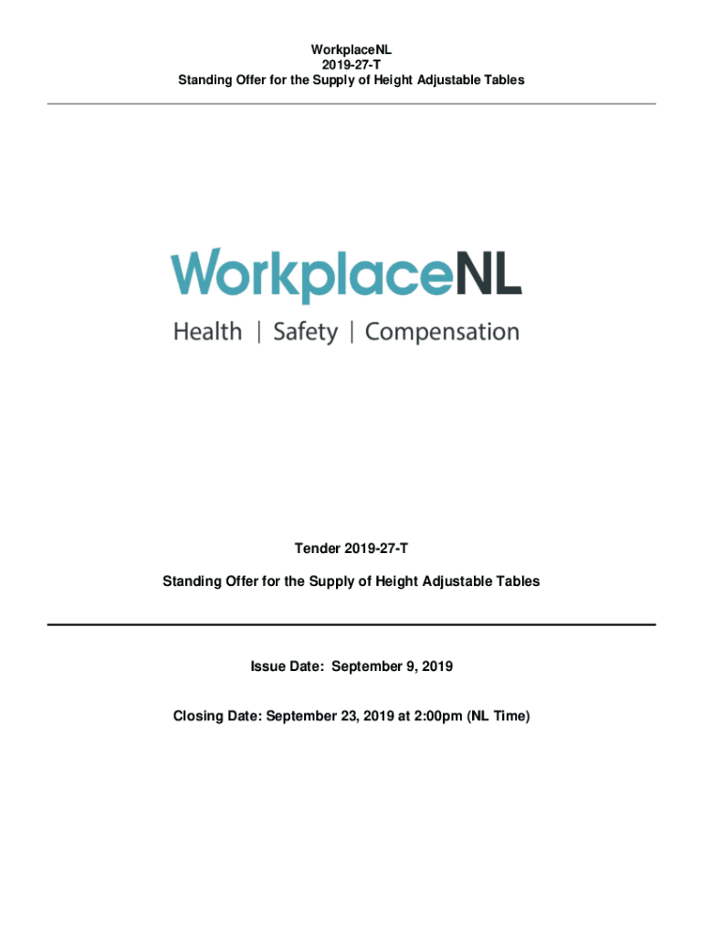 Workplace NL 201927T Standing Offer for the Supply of Height Adjustable TablesTender 201927T Standing Offer for the Supply of Height Adjustable TablesIssue Date: September 9, 2019Closing Date: September