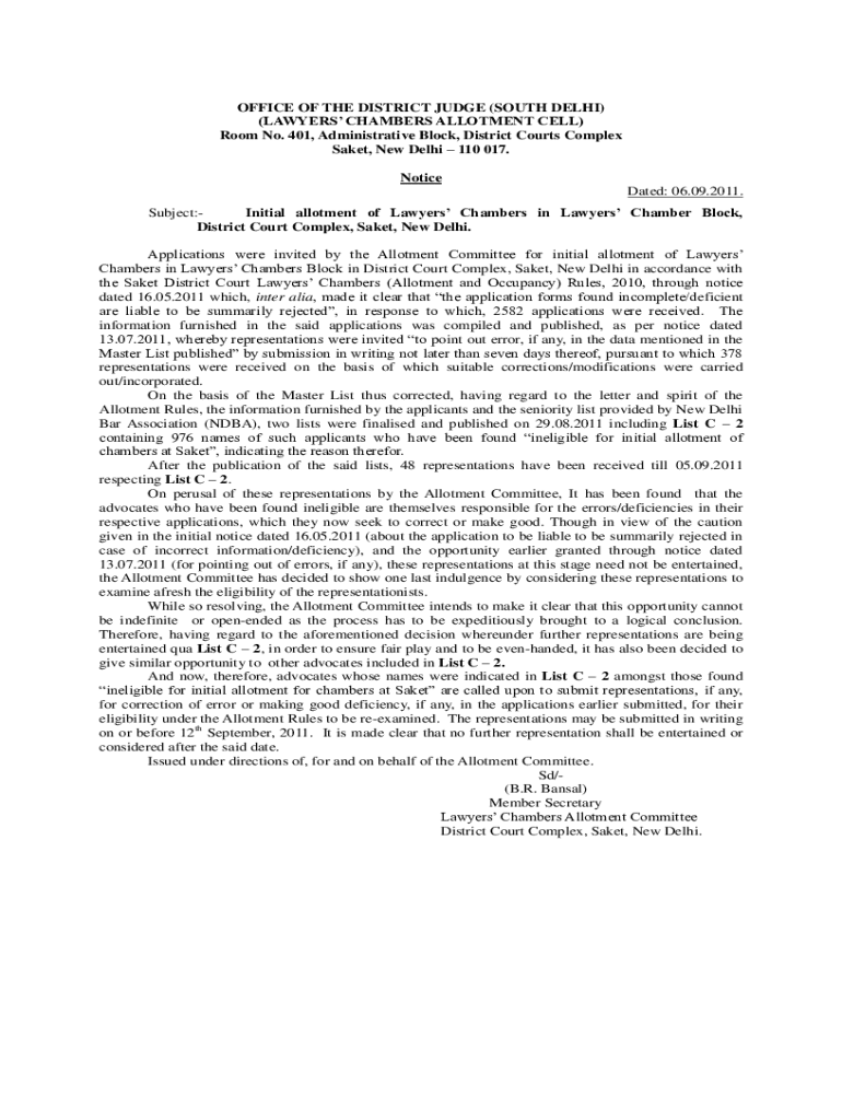OFFICE OF THE DISTRICT JUDGE (SOUTH DELHI) (LAWYERS CHAMBERS ALLOTMENT CELL) Room No. 401, Administrative Block, District Courts Complex Sake, New Delhi 110 017. Notice Dated: 06.09.2011. Subject:Initial