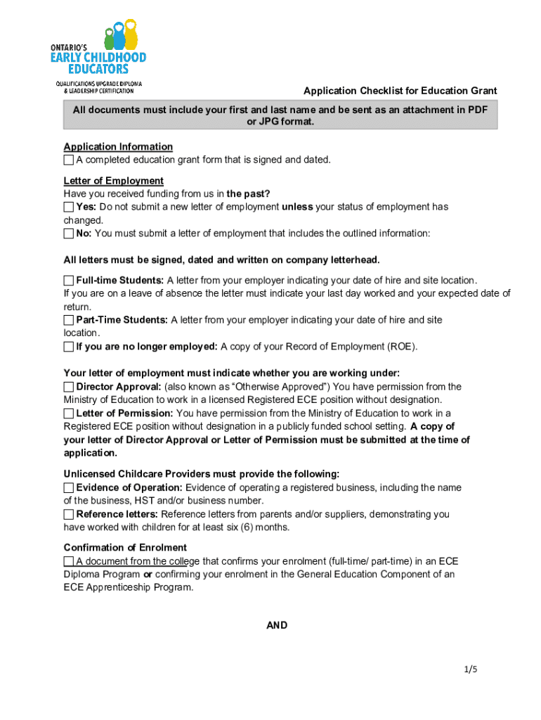 Application Checklist for Education Grant All documents must include your first and last name and be sent as an attachment in PDF or JPG format. Application Information A completed education grant