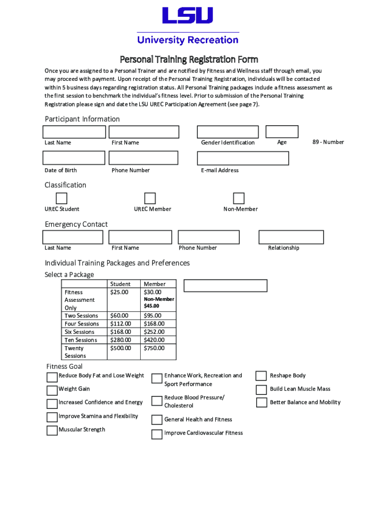 Get the free Personal Training Registration Form - Louisiana State University
