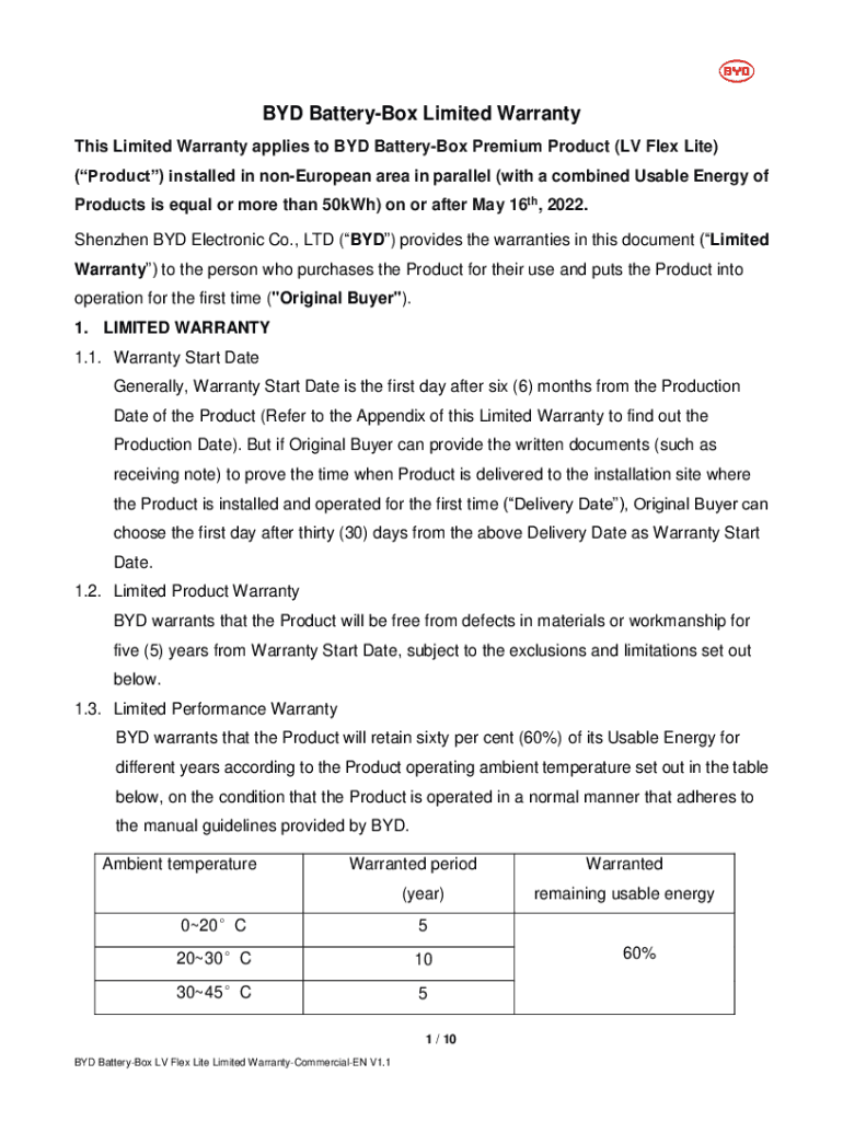 BYD Battery Limited Warranty This Limited Warranty applies to BYD Battery Premium Product (LV Flex Lite) (Product) installed in non-European area in parallel (with a combined Usable Energy of Products