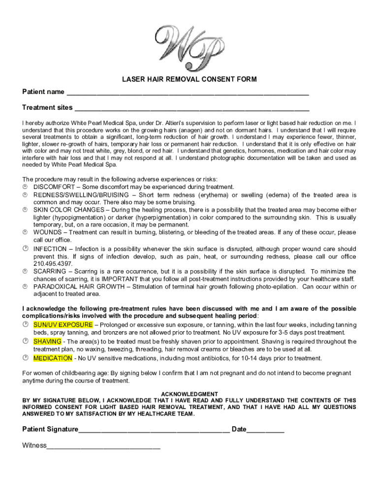 LASER HAIR REMOVAL CONSENT FORM Patient name ___ Treatment sites ___ I hereby authorize White Pearl Medical Spa, under Dr. Alters supervision to perform laser or light based hair reduction on me.