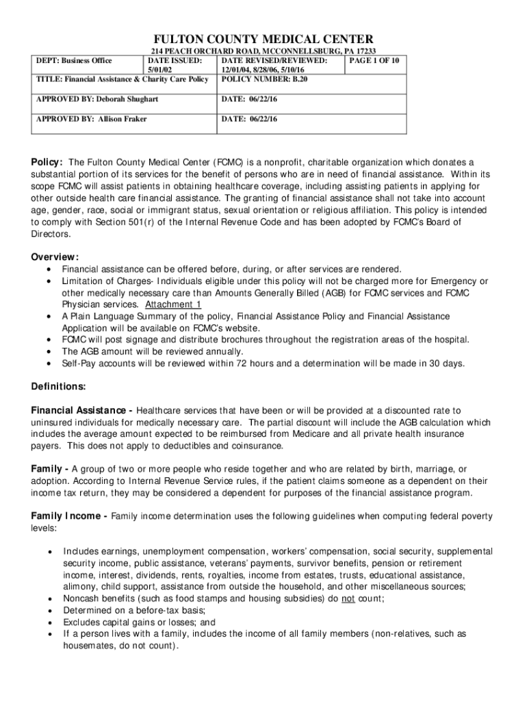 FULTON COUNTY MEDICAL CENTER 214 PEACH ORCHARD ROAD, MCCONNELLSBURG, PA 17233 DEPT: Business Office DATE ISSUED: DATE REVISED/REVIEWED: PAGE 1 OF 10 5/01/02 12/01/04, 8/28/06, 5/10/16 TITLE: Financial
