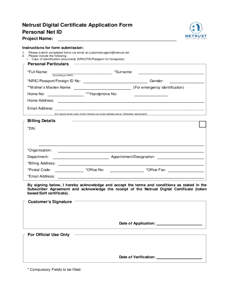 Ne trust Digital Certificate Application Form Personal Net ID Project Name: Instructions for form submission: 1. 2. Please submit completed forms via email at customersupport@netrust.net Please include