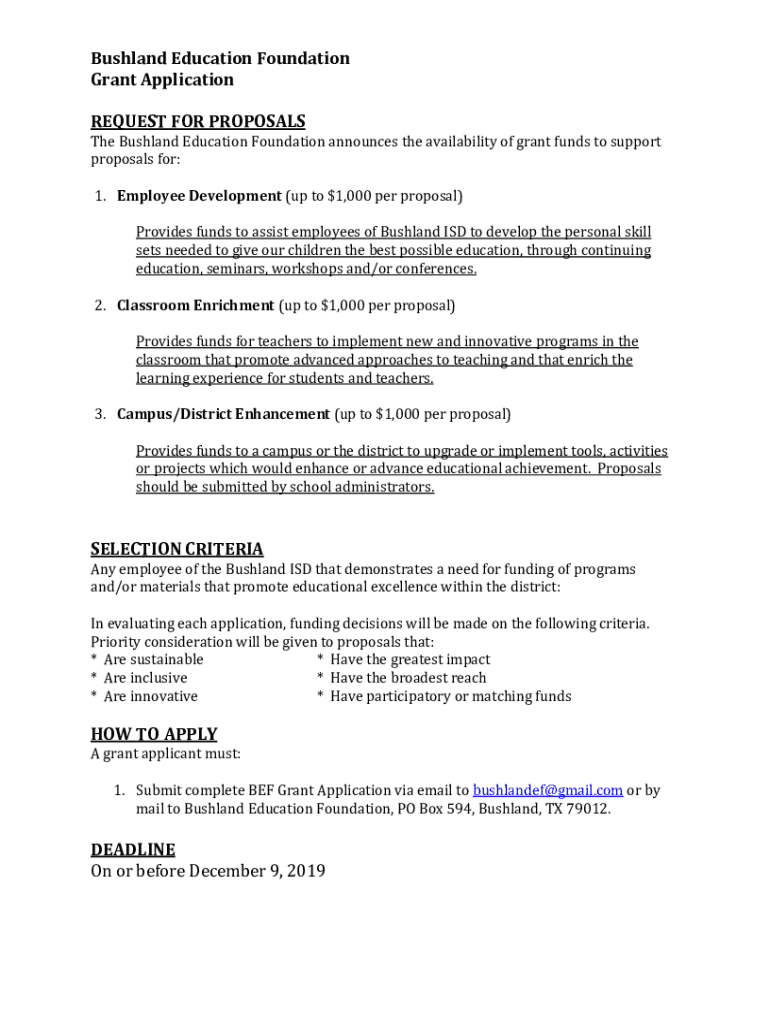Bushland Education Foundation Grant Application REQUEST FOR Proposals Bushland Education Foundation announces the availability of grant funds to support proposals for: 1. Employee Development (up