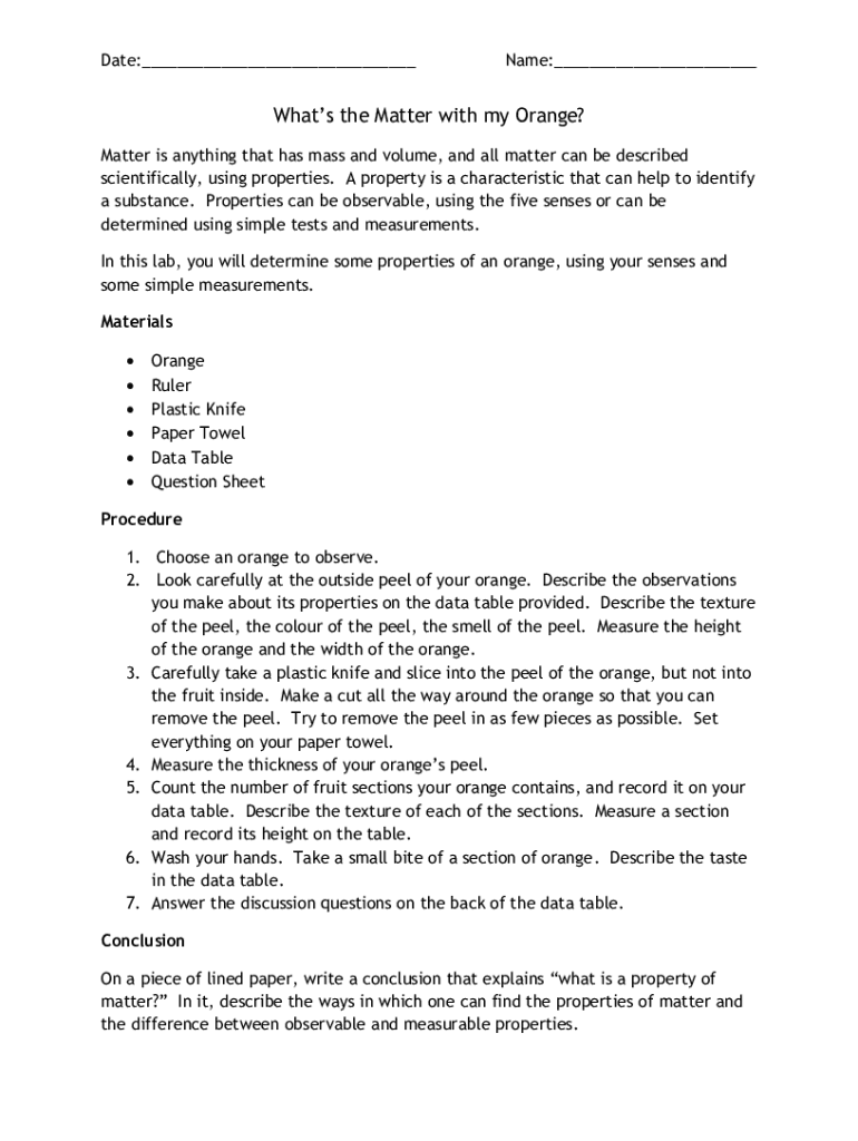 Date:___Name:___What's the Matter with my Orange? Matter is anything that has mass and volume, and all matter can be described scientifically, using properties. A property is a characteristic that