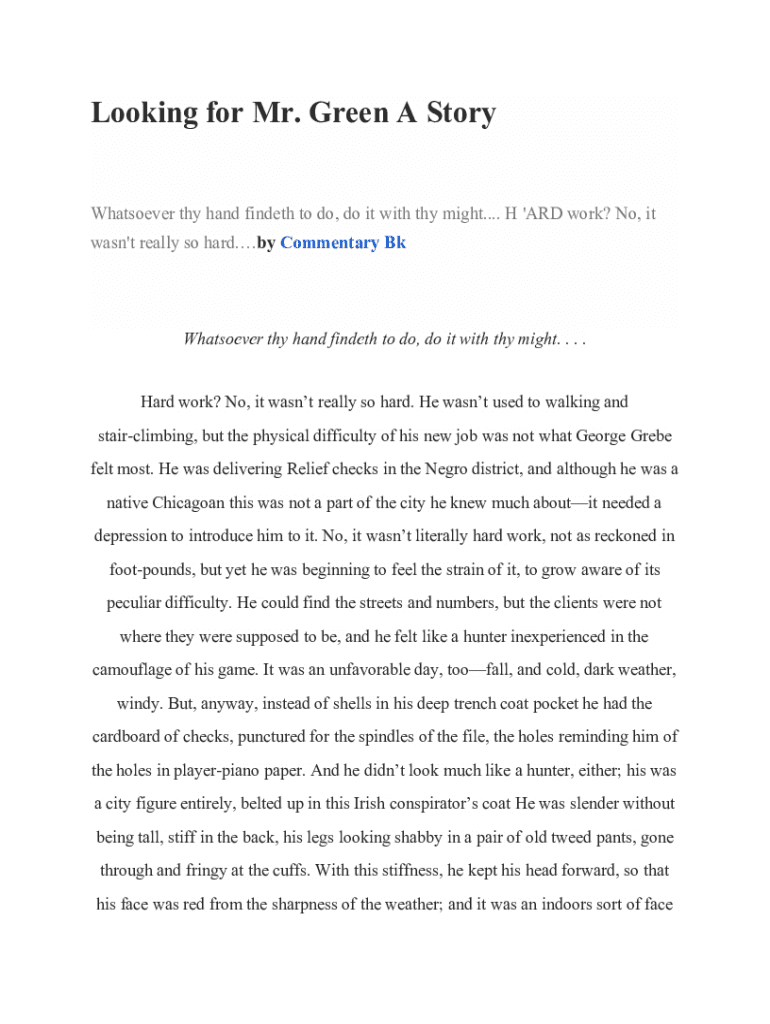 Looking for Mr. Green A Story Whatsoever thy hand finder to do, do it with thy might.... H \'ARD work? No, it wasn't\'t really so hard. By Commentary Whatsoever thy hand finder to do, do it with thy