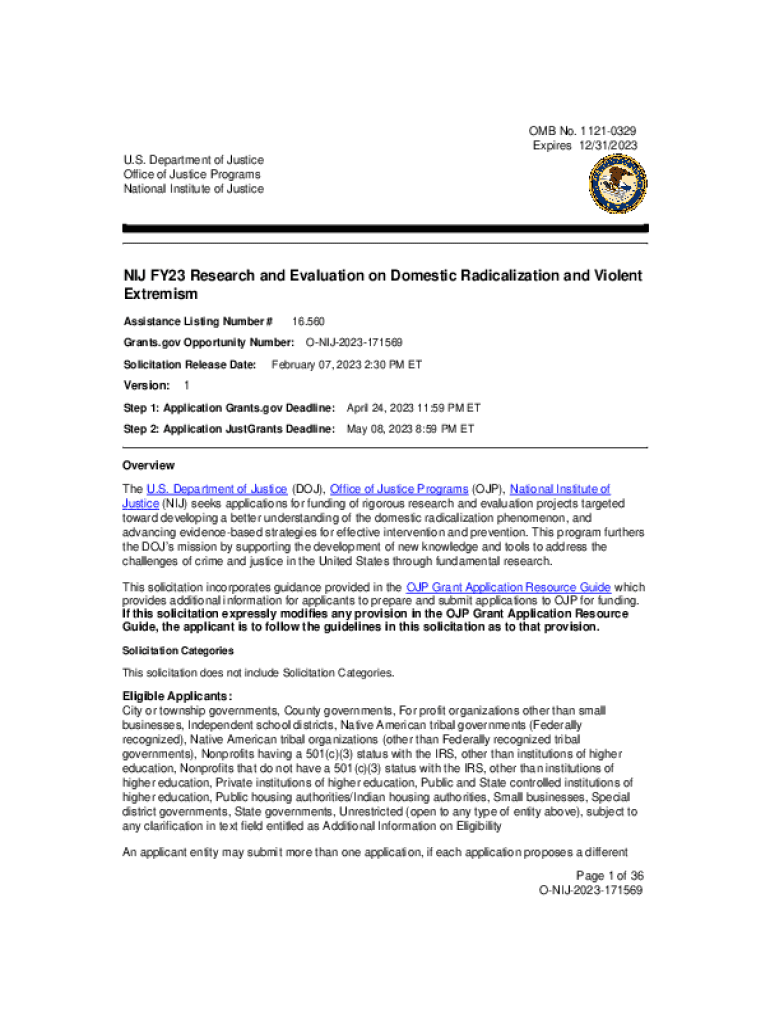 OMB No.11210329 Expires 12/31/2023 U.S. Department of Justice Office of Justice Programs National Institute of Justice FY23 Research and Evaluation on Domestic Radicalization and Violent Extremism