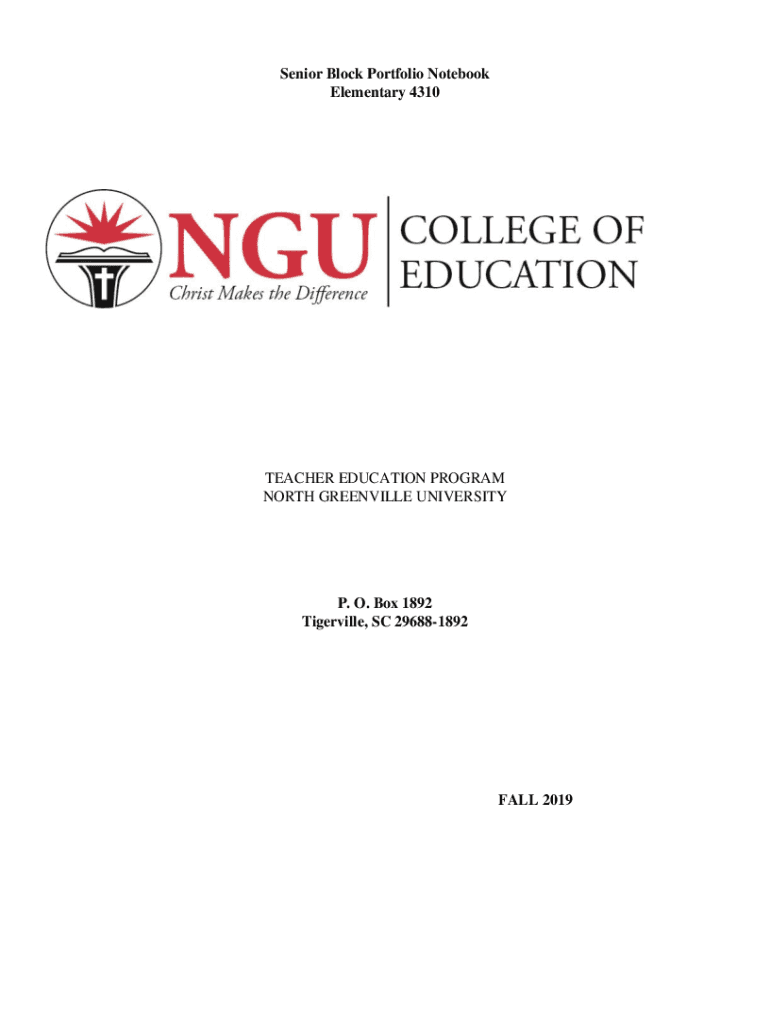 Senior Block Portfolio Notebook Elementary 4310TEACHER EDUCATION PROGRAM NORTH GREENVILLE UNIVERSITY. O. Box 1892 Libreville, SC 296881892FALL 2019Assignments for Senior Block Teacher Candidates Teacher