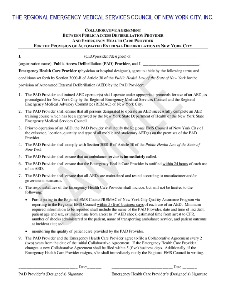 THE REGIONAL EMERGENCY MEDICAL SERVICES COUNCIL OF NEW YORK CITY, INC. COLLABORATIVE AGREEMENT BETWEEN PUBLIC ACCESS DEFIBRILLATION PROVIDER AND EMERGENCY HEALTH CARE PROVIDER FOR THE PROVISION OF