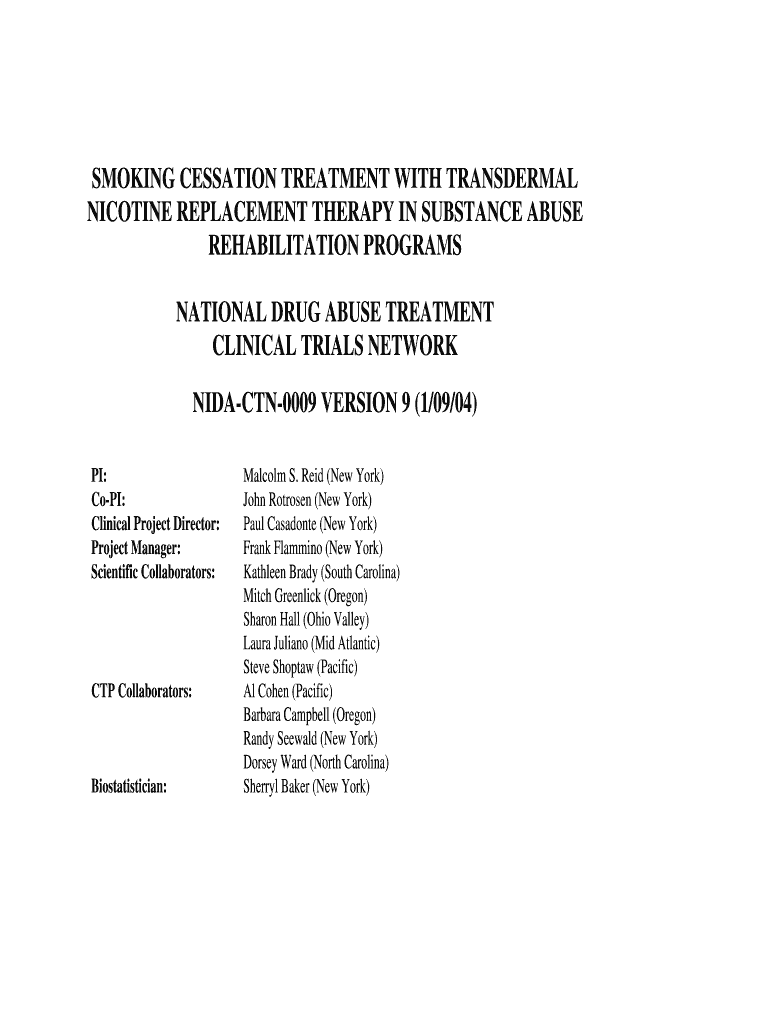 This document outlines a clinical trial to investigate the efficacy of smoking cessation treatment through transdermal nicotine replacement therapy combined with behavioral therapy in substance abuse