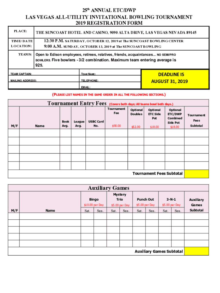 25th ANNUAL ETC/DSP LAS VEGAS UTILITY INVITATIONAL BOWLING TOURNAMENT 2019 REGISTRATION FORM PLACE:THE SEACOAST HOTEL AND CASINO, 9090 ALTA DRIVE, LAS VEGAS NEVADA 8914512:30 P.M. SATURDAY, OCTOBER