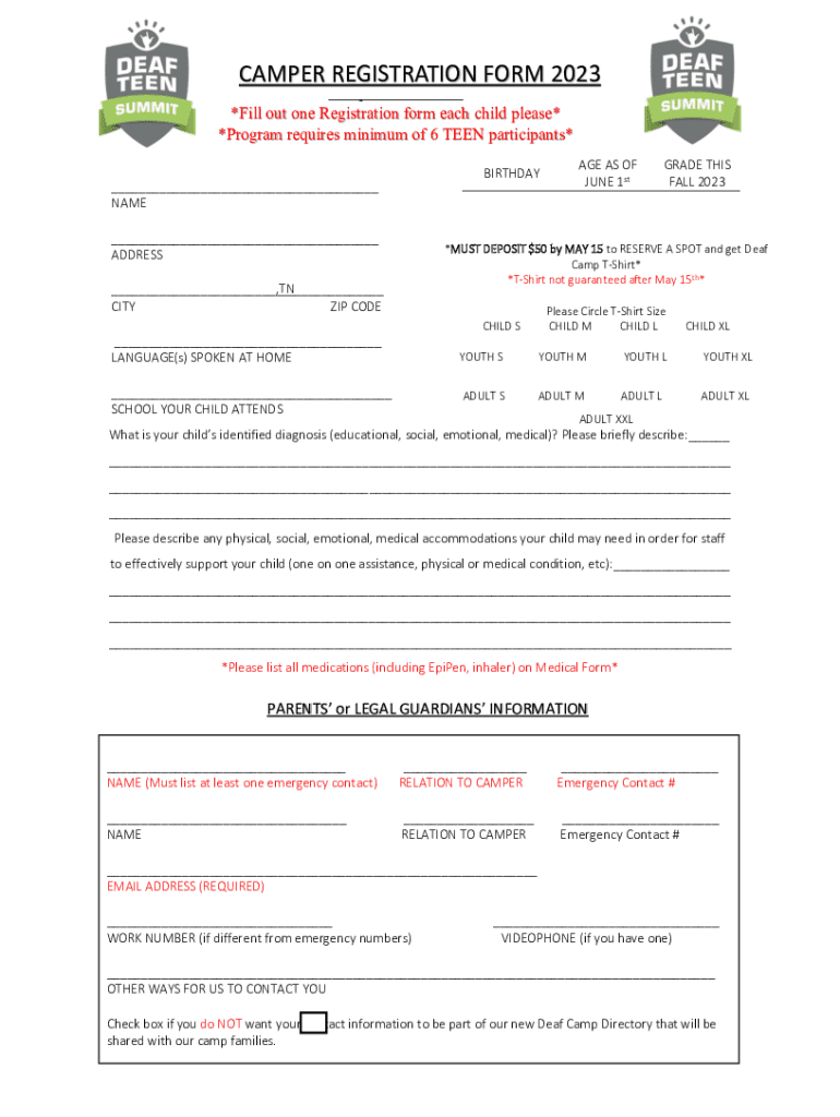 CAMPER REGISTRATION FORM 2023Camper Information *Fill out one Registration from each child please* *Program requires minimum of 6 TEEN participants* BIRTHDAY___ NAME ___ ADDRESS AGE AS OF JUNE 1stGRADE